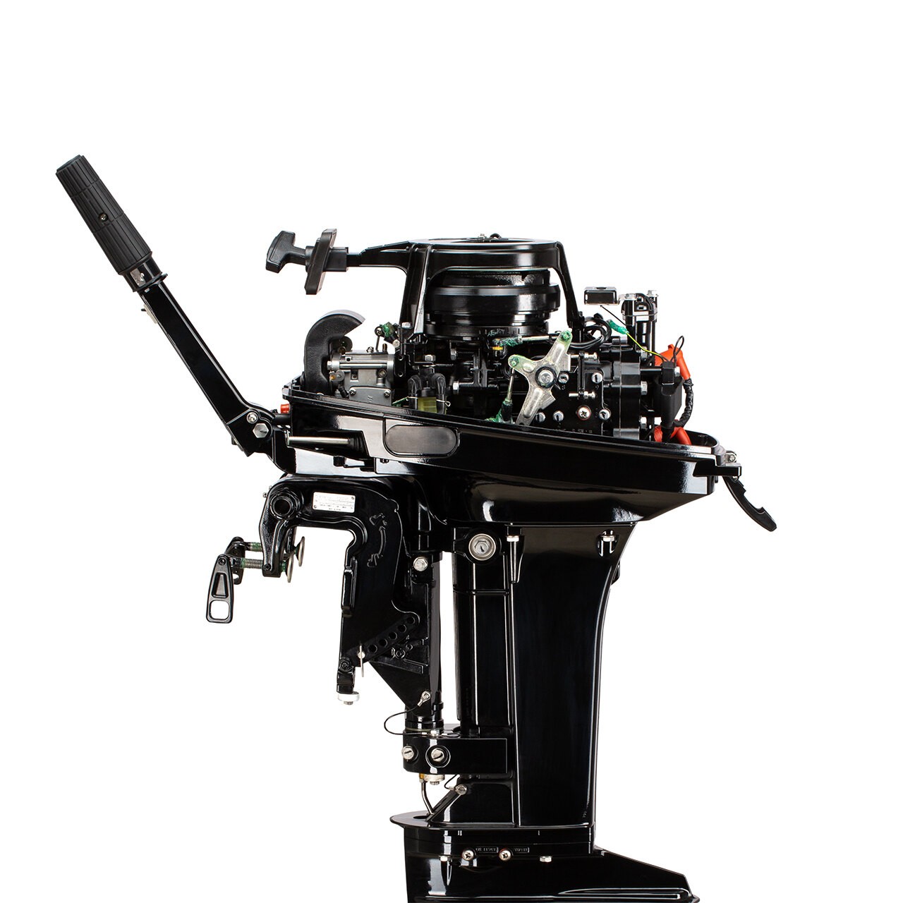 Переключение передач осуществляется рычагом в сбоку. Положений у рычага три — вперед, нейтраль, назад. Кнопка остановки двигателя находится на румпеле, она снабжена предохранительной чекой экстренного выключения.