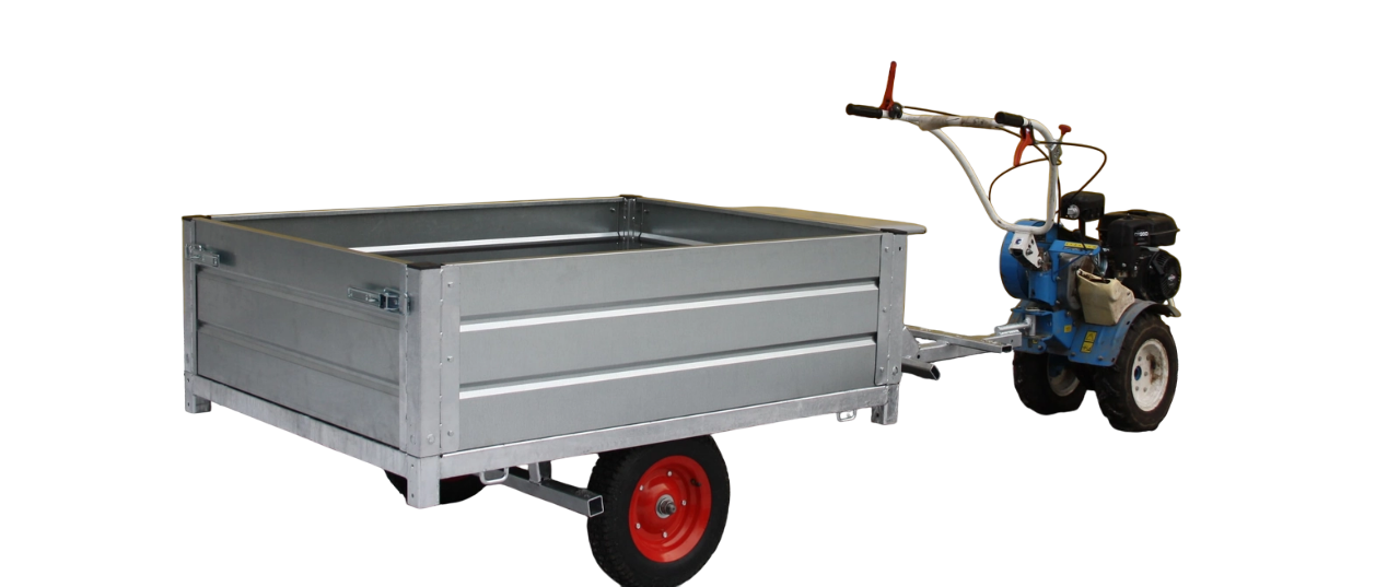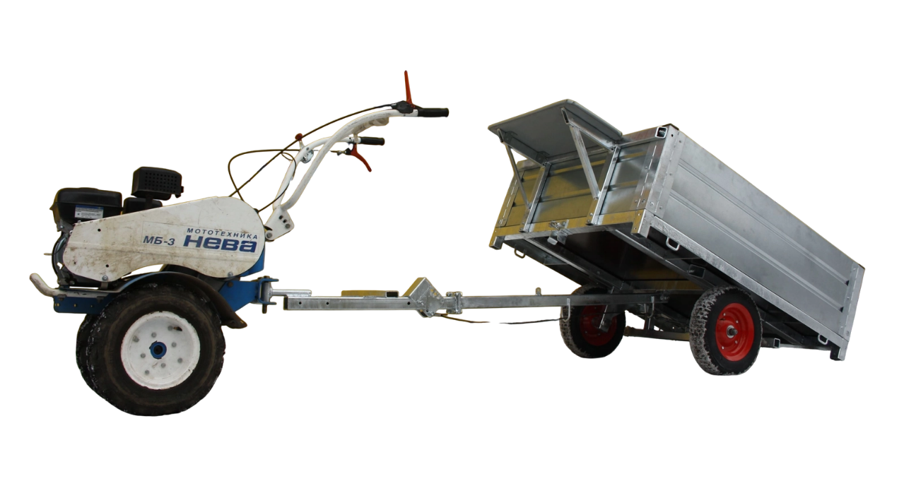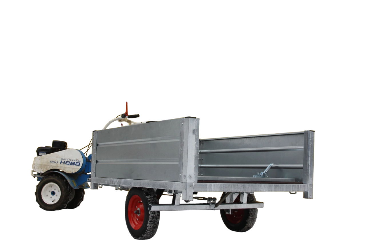 Прицеп (тележка) для мотоблока ЛАВ-81002 предназначен для перевозки различных грузов (сыпучих, сельхозпродукции, стройматериалов и т.д.) с использованием мотоблока по территории садов и огородов, коммунальных и домовых приусадебных хозяйств. Кузов самосвальный. Рама и дышло прицепа полностью оцинкованы методом горячего цинкования. Борта из оцинкованной стали. Прицеп одноосный, с механической тормозной системой, снабжен откидным кузовом, задний борт съемный. Днище - ламинированная фанера 9 мм. Высота бортов 380 мм. Грузоподъёмность 405 кг. Размеры кузова 1400*1100 мм. Прицеп поставляется в полусобранном виде (кузов, дышло, стойки с колесами, сидение)