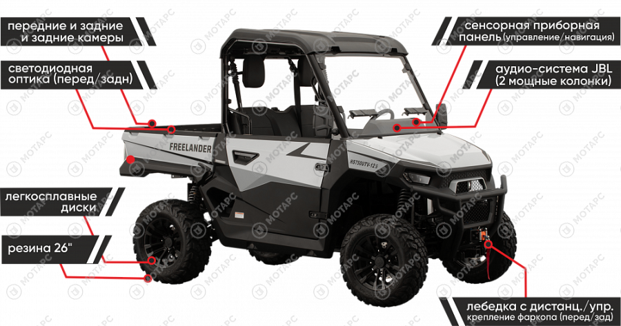 Марка HISUN Модель 550 FREELANDER LIMITED Тип мотоцикла Багги Тип двигателя Бензиновый Модель двигателя 4-тактный, одноцилигдровый/ DOHC Число цилиндров 1 Число тактов 4 Объем двигателя, см3 540 Мощность, л.с. 36 Максимальная скорость, км/ч 75 Макс. крутящий момент, нм 45 Охлаждение Жидкостное Электростартер Да Система подачи топлива Инжектор Тип зажигания Электронный впрыск топлива EFI Коробка передач Вариатор Тип привода Кардан Привод 2WD/4WD/4WD с блокировкой переднего дифференциала Емкость топливного бака 28 Передняя подвеска независимая, на двойных А-образных рычагах/со стабилизатором поперечной устойчивости, на продольных нижних рычагах Задняя подвеска независимая, с двумя А-образными рычагами с регулируемыми газомасляными амортизаторами Тормозная система Гидравлическая дисковая Колеса 14 / 14 Переднее колесо 26Х9-14 Заднее колесо 26Х11-14 Длина, мм 2964 Ширина, мм 1615 Высота, мм 1986 Колесная база, мм 1949 Клиренс / Дорожный просвет, мм 279 ПТС / ПСМ Да -