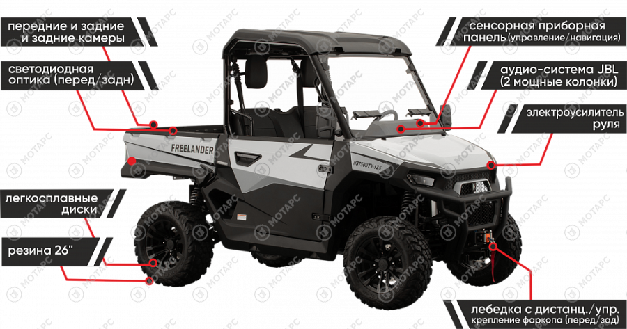 Марка HISUN Модель 750 FREELANDER LIMITED Тип мотоцикла Багги Тип двигателя Бензиновый Модель двигателя 4-тактный, одноцилигдровый/ DOHC Число цилиндров 1 Число тактов 4 Объем двигателя, см3 735 Мощность, л.с. 36 Максимальная скорость, км/ч 75 Макс. крутящий момент, нм 54 Охлаждение Жидкостное Электростартер Да Система подачи топлива Инжектор Тип зажигания Электронный впрыск топлива EFI Коробка передач Вариатор Тип привода Кардан Привод 2WD/4WD/4WD с блокировкой переднего и заднего дифференциалов Емкость топливного бака 28 Передняя подвеска независимая, на двойных А-образных рычагах/со стабилизатором поперечной устойчивости, на продольных нижних рычагах Задняя подвеска независимая, с двумя А-образными рычагами с регулируемыми газомасляными амортизаторами Максимальная нагрузка, кг 432 Тормозная система Гидравлическая дисковая Колеса 14 / 14 Переднее колесо 26Х9-14 Заднее колесо 26Х11-14 Длина, мм 2964 Ширина, мм 1615 Высота, мм 1986 Колесная база, мм 1949 Клиренс / Дорожный просвет, мм 279 ПТС / ПСМ Да -